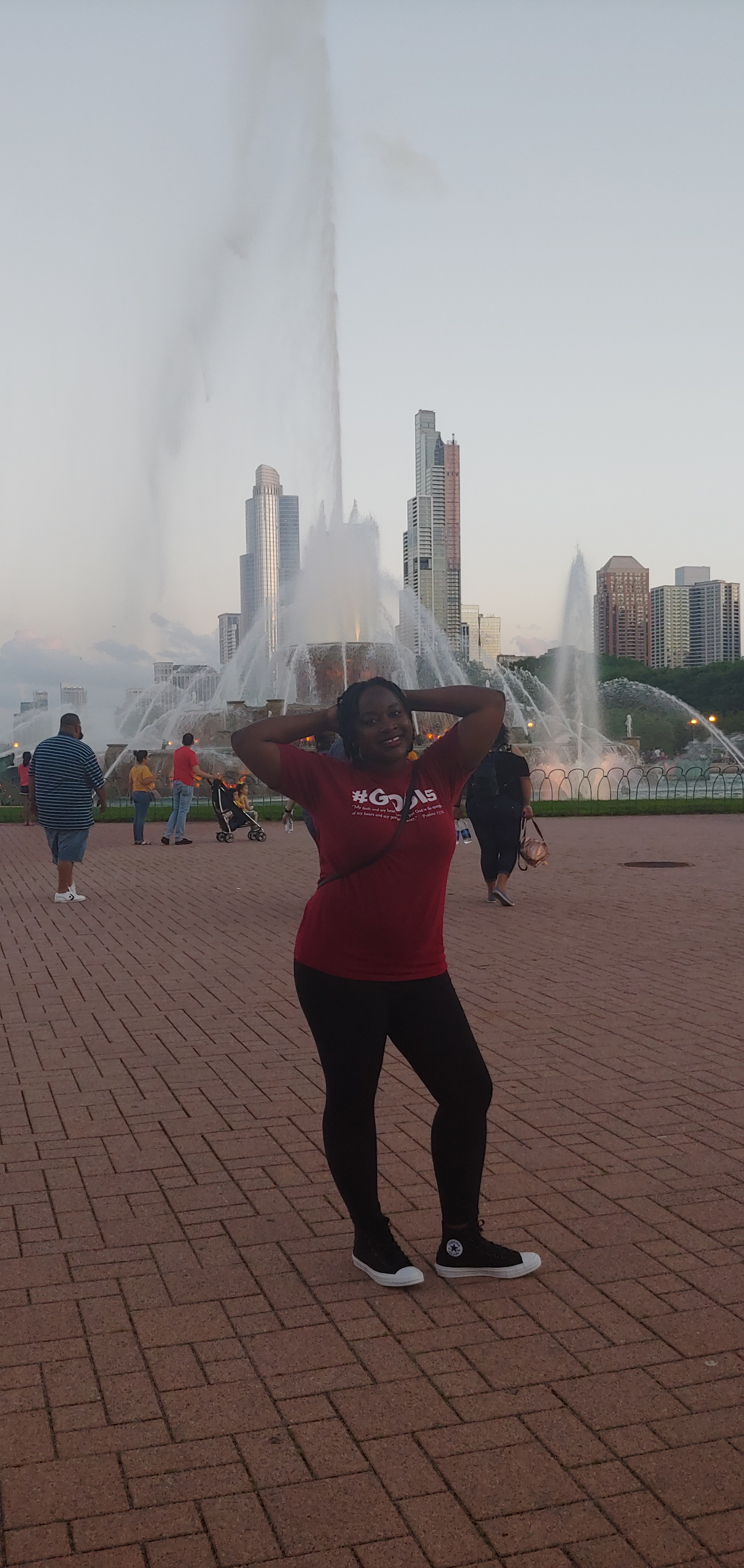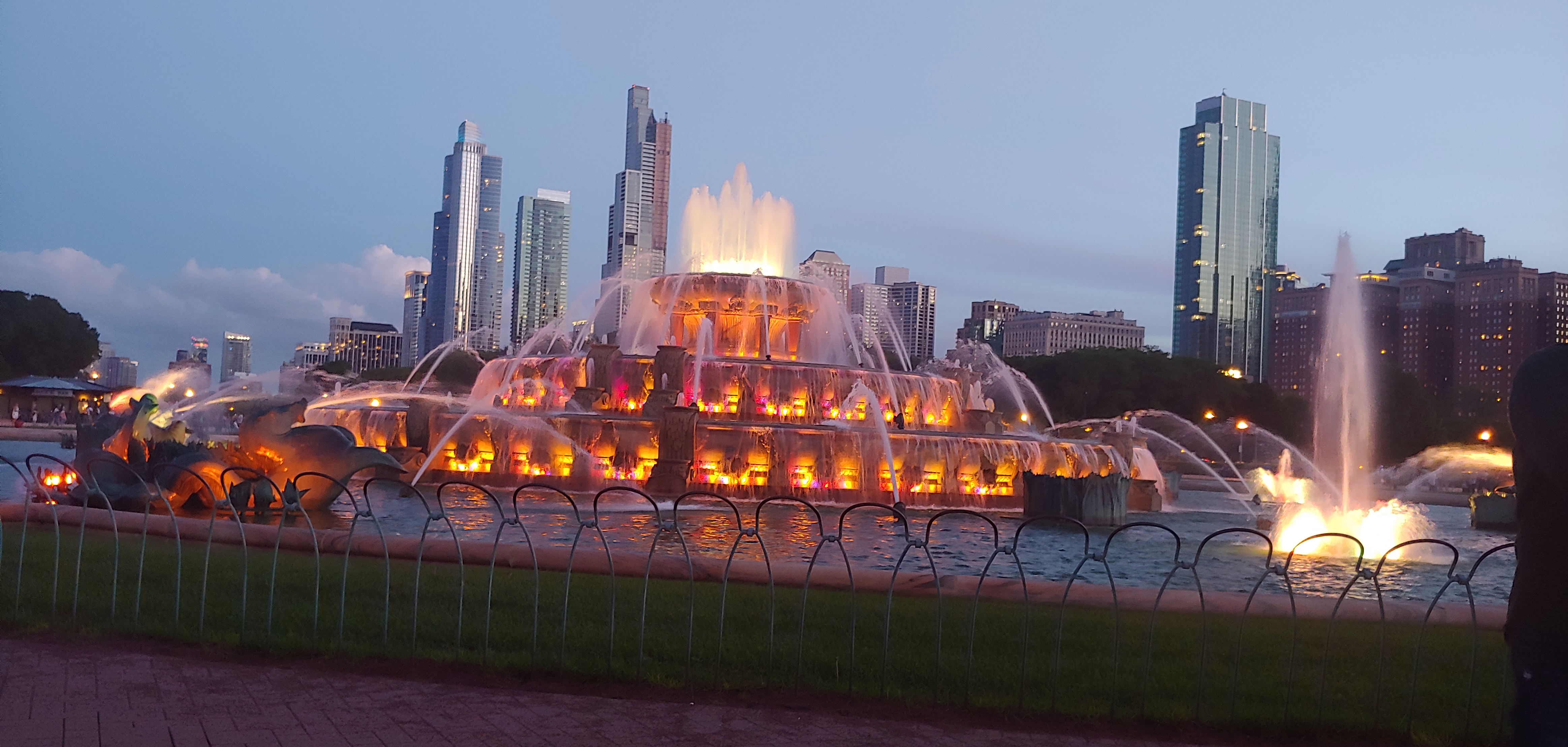 Across from the lake where we were is the great Buckingham Fountain. This fountain is huge and the water shoots up way high. On a very hot day in Chicago, the mist from the fountain is very welcoming. We were lucky enough to come upon the fountain just as it was turning dusk. Since the fountain lights up with many colors at night, it became a dazzling centerpiece. The views of the city from this area was also spectacular.