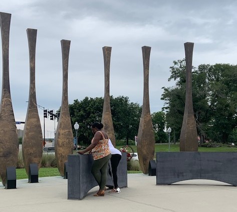 After leaving the restaurant, we exercised the calories away from our burgers and wings by taking a long walk to the edge of downtown to visit the 1898 Monument at Memorial Park. Usually when we visit a new city, we look forward to discovering places or activities pertaining to Black culture. The 1898 Monument commemorates the time in Wilmington’s history when elite White citizens overthrew the local government because Black members were elected. Several Black people in the city were killed by White mobsters as a result of the violence that erupted. The monument was sculpted as a reminder of the continued efforts to unify Wilmington. While visiting the memorial, we took a moment to read about the historical event that had occurred and to reflect on how it was relevant to the racial biases still being experienced today and the reasons for the worldwide protests that were even taking place in Wilmington at the time of our visit.
